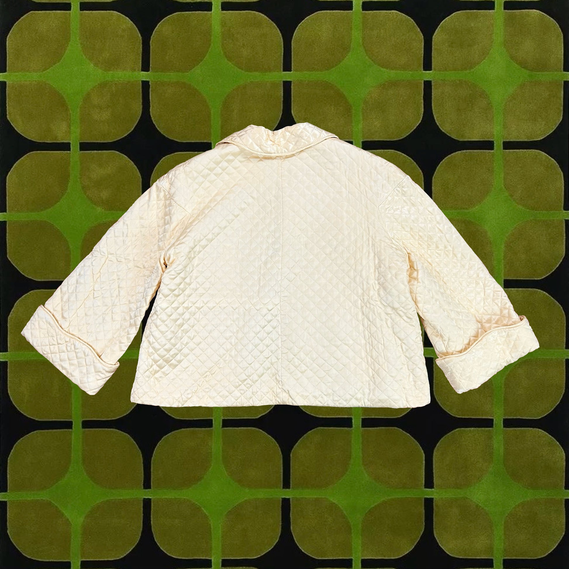 Vintage 1960's Barbizon cream satin quilted bed jacket adorned with pins