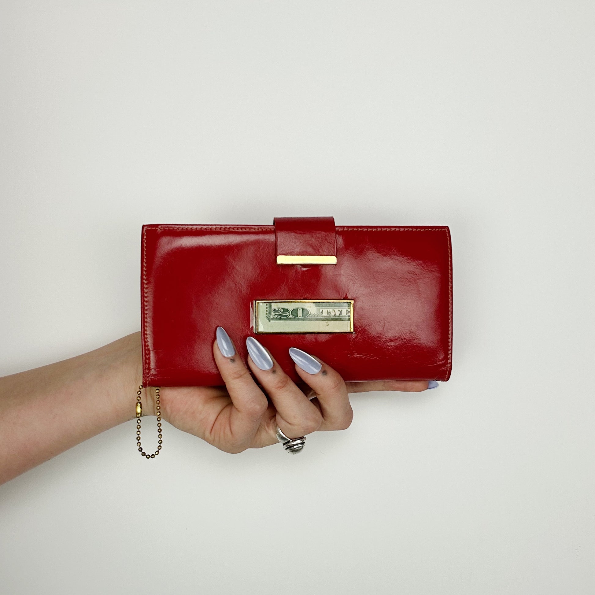 Vintage 1960's patent red genuine cowhide wallet. Gold hardware. Lots of compartments.