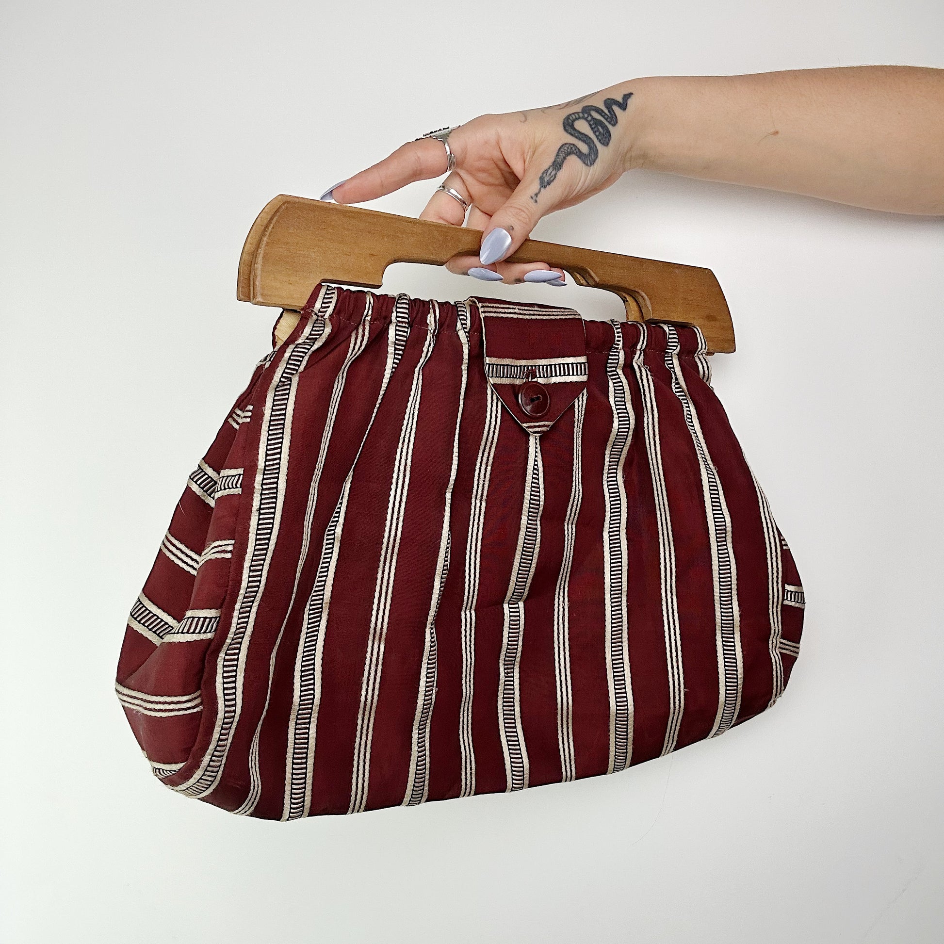 Vintage 1970's handmade wooden handle purse. Striped fabric. Button closure. Minimal design.