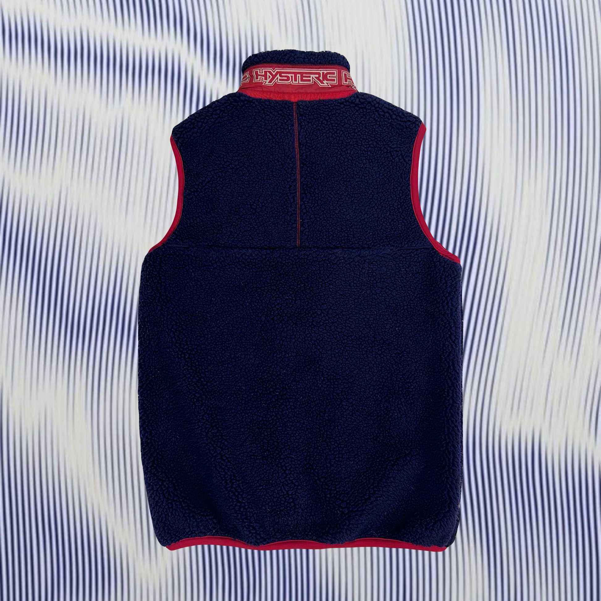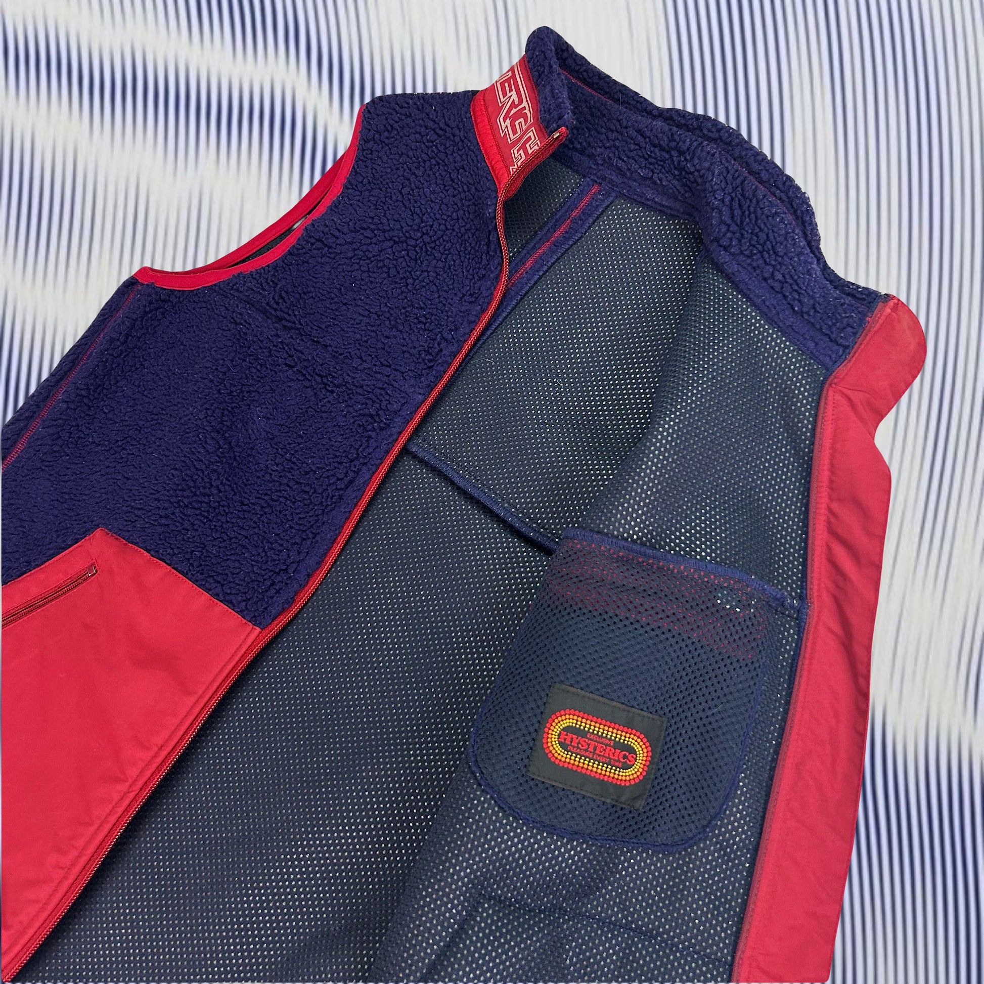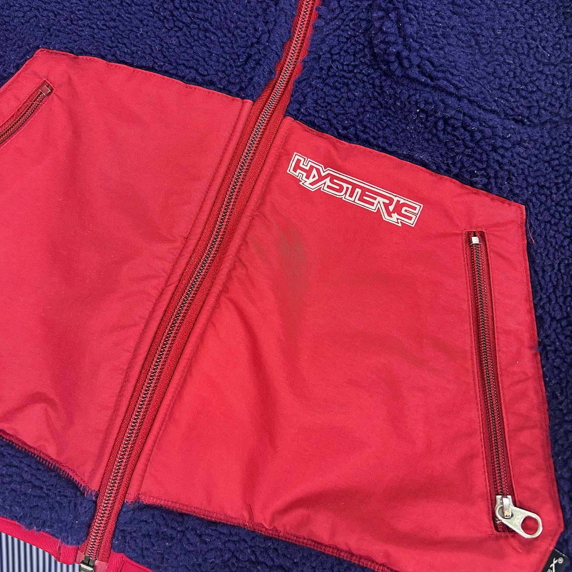 Rare Hysteric Glamour boa sherpa zip up vest in a navy blue/ red colorway