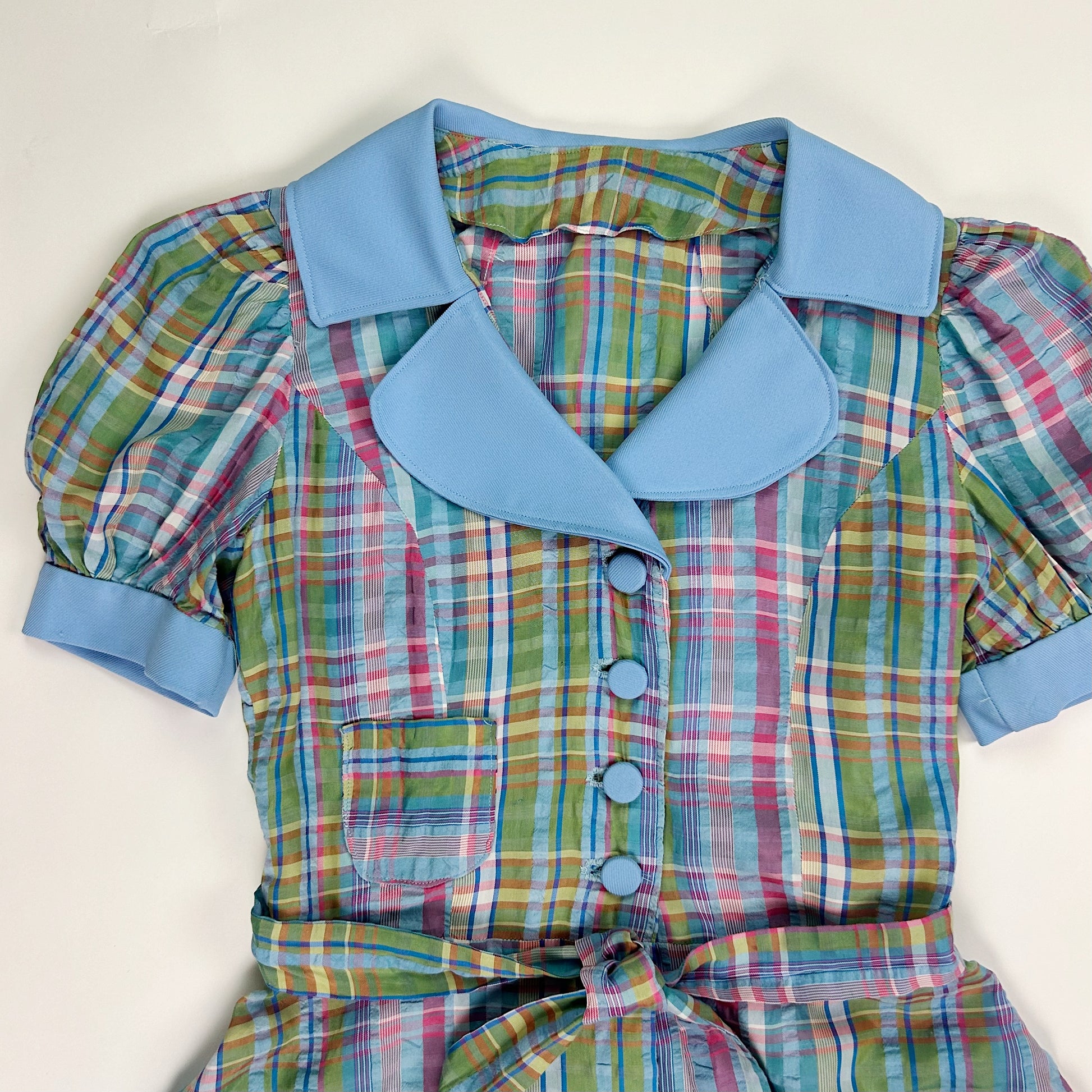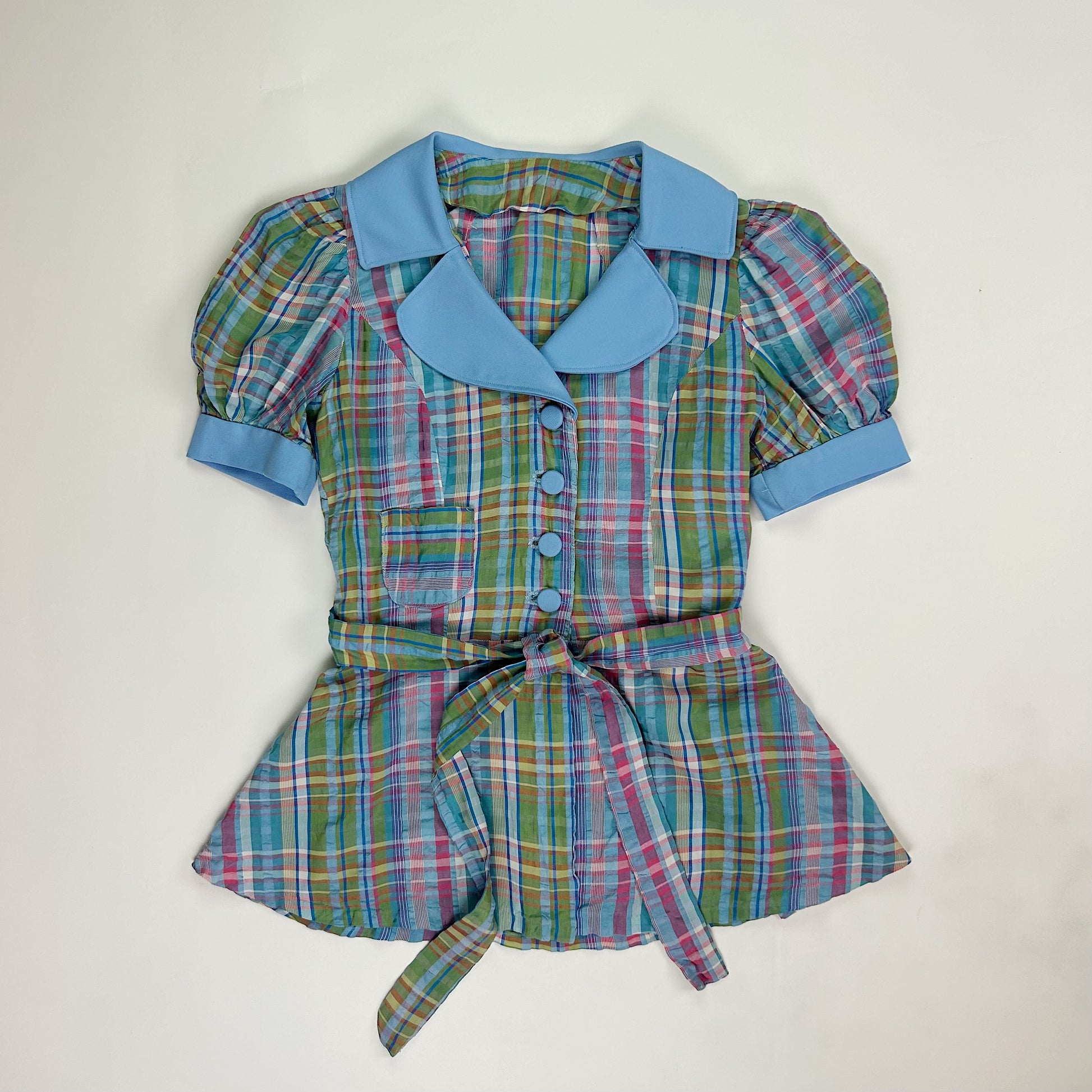 Vintage 1970's handmade springy blue plaid puff sleeve button up blouse with small functional pocket, tie detail and darling collar